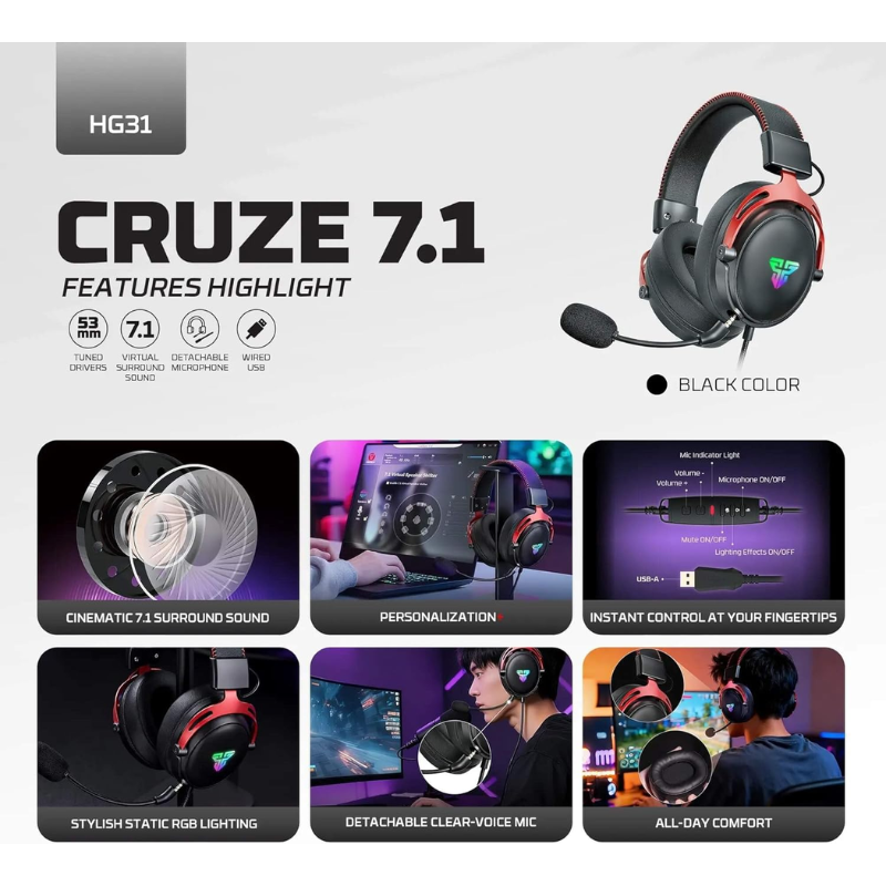 The Fantech Gaming CRUZE HG31 Headset is a high-performance wired gaming headset designed for immersive sound, clear communication, and all-day comfort. Featuring 7.1 surround sound over USB, this headset delivers rich audio quality that enhances your gaming, multimedia, and virtual communication experiences. Its optimized design and premium components make it a reliable choice for gamers, streamers, and content creators.